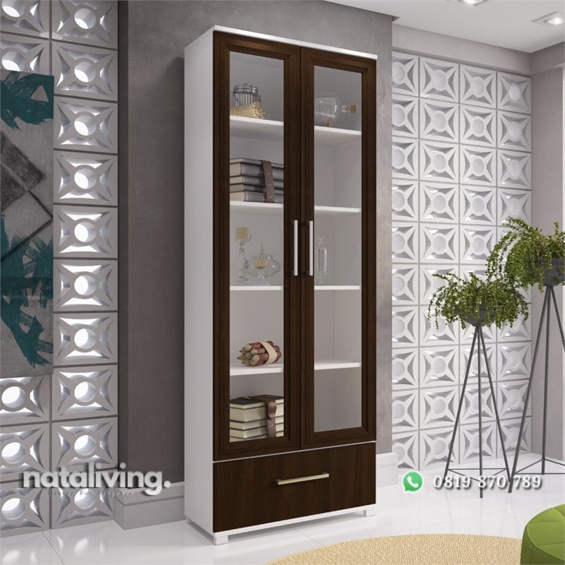 Almari pajangan dengan tampilan segar dikombinasikan dengan warna putih dan coklat yang mengkilap. Desainnya sangat stylish dan modern. Ada pintu kaca dan laci, tarikannya memakai stainless yang memberi tampilan lebih menawan.