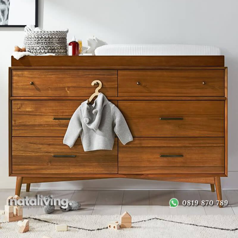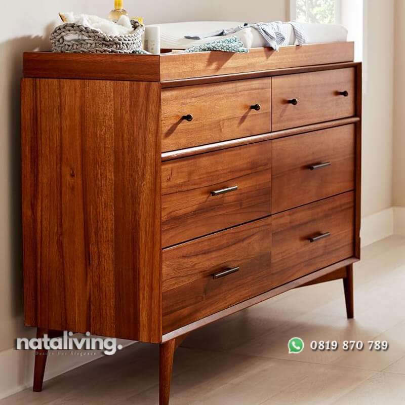 Produk satu ini merupakan pilihan yang paling tepat bagi bunda untuk melengkapi kebutuhan funiture untu merawat si kecil. Terbuat dari material kayu jati pilihan dengan konsep minimalis 6 laci model terbaru yang memiliki bentuk kaki ramping meruncing ala retro style. Dan pastinya tampilannya sangat cantik karena berlapis wood finishing warna walnut yang sangat rapi.