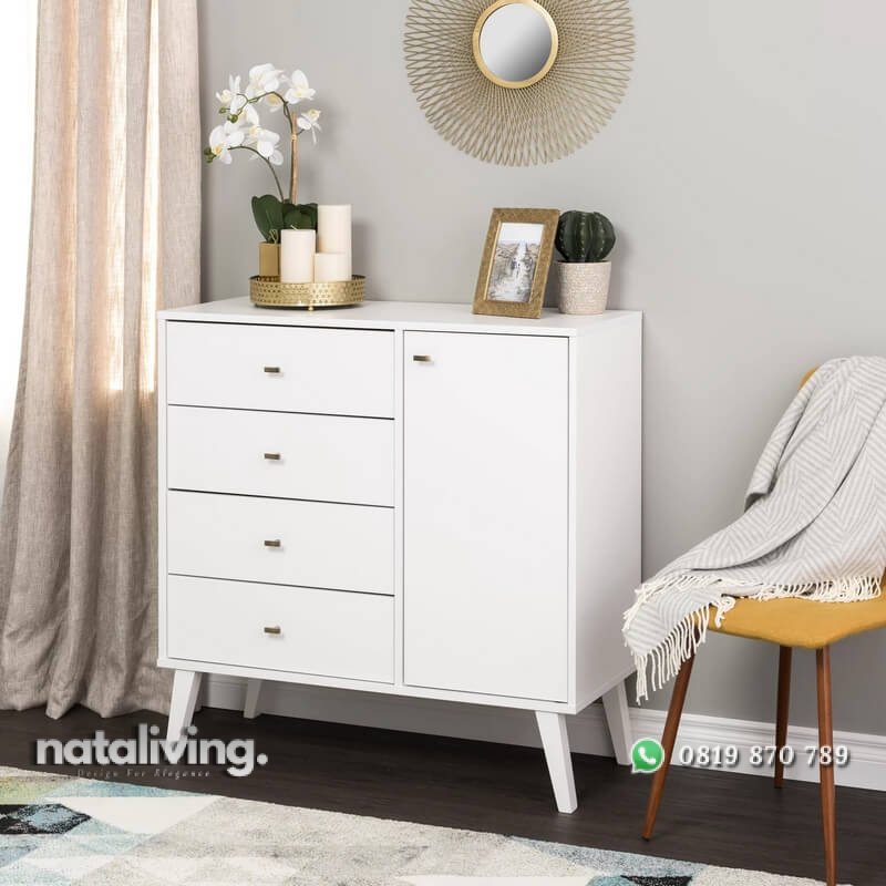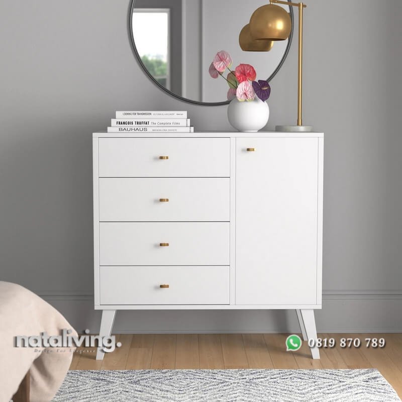 Desain keren nan kekinian hadir pada produk bufet warna putih dari jepara satu ini. Dimana desainnya mengusung konsep minimalis gaya terbaru yang memiliki 4 laci dan 1 tempat penyimpanan berpintu. Dan bentuk kakinya juga ramping meruning khas retro modern yang sedang trend saat ini. Serta visualnya dimaximalkan dengan lapisan cat duco putih tebal, halus dan rapi. Sehingga menjadikan furniture dari bahan kayu mahoni oven ini patut anda jadikan acuhan dalam melengkapi perabot di rumah anda.