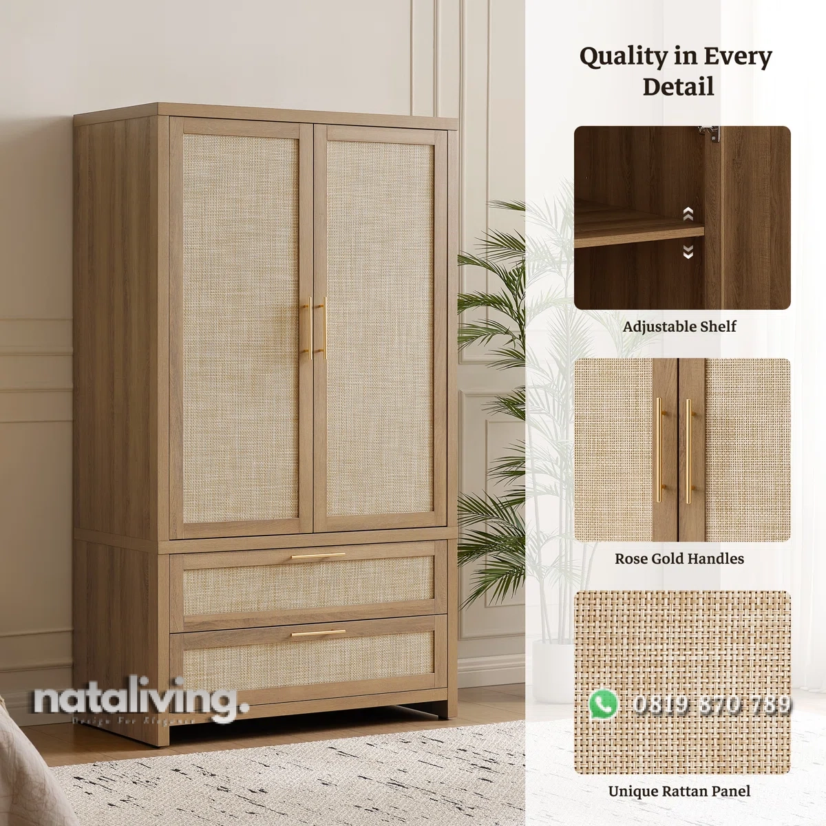 ini sangat cocok untuk menjadi salah satu pilihan bagi Anda yang sedang mencari produk furniture Lemari Pakaian untuk pelengkap di ruang Kamar. Karena desain dari produk Lemari Pakaian ini sangat elegant dengan mengusung tema minimalis bergaya terbaru yang sangat modis dan kekinian. Serta memiliki visual yang menawan berkat lapisan wood finishing dan juga kombinasi rotan sintetis sehingga produk ini akan memberikan kesan yang sangat mewah juga elegant. Dan pastinya, bahan baku utama dari produk Lemari Pakaian ini diolah menggunakan kayu jati pilihan sehingga terjamin akan mutu, awet dan kualitasnnya.