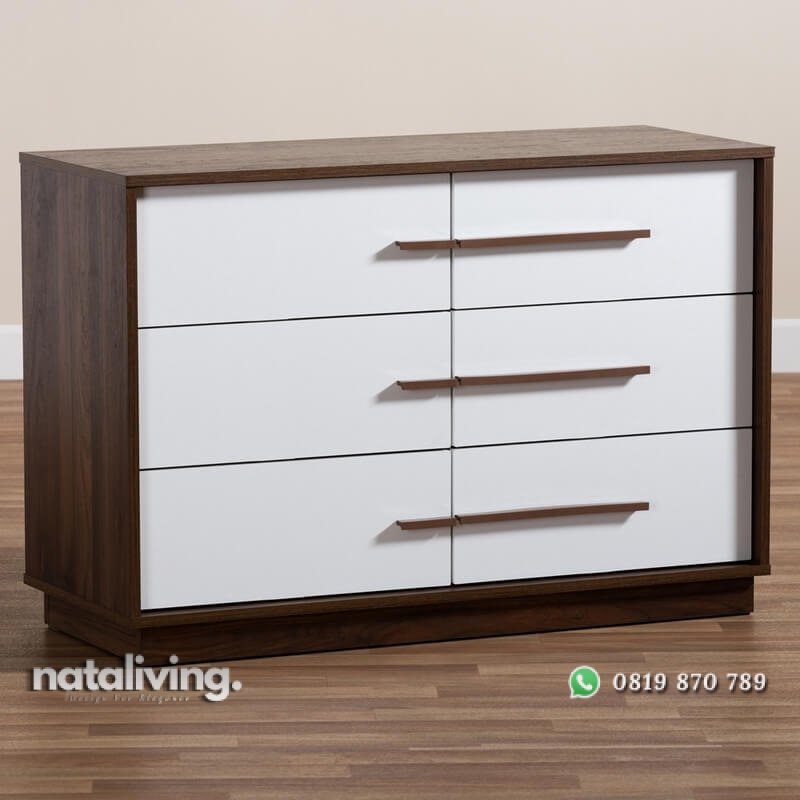 Sangat cocok sekali untuk menjadi pelengkap furniture pada kamar utama anda. Dimana produk satu ini berfungsi sebagai tempat penyimpanan barang atau baju anda. Dresser satu ini hadir dengan koinsep minimalis sederhana model terbaru yang memiliki 6 laci extra besar. Sehingga mampu menyimpan banyak benda-benda yang anda ingin simpan. Dan tentu saja produk ini diolah menggunakan bahan kayu jati mix kayu mahoni oven pada bagian pintu lacinya. Serta tampilannya juga sangat modis dengan kombinasi warna walnut brown dan white / putih.