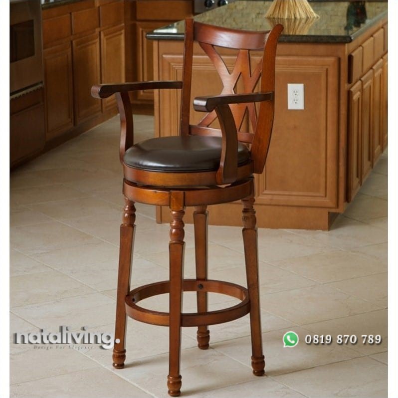 Kursi bar cafe dengan desain minimalis modern dan dudukan yang bisa berputar, material kayu jati tua dan warna finishing natural melamine cerah.