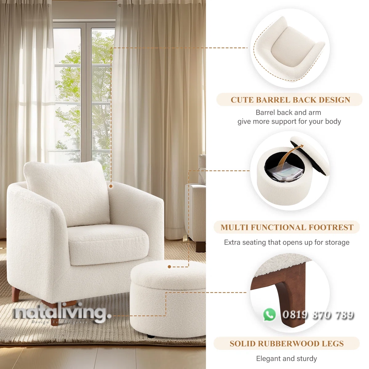 Set kursi ini memiliki sandaran melengkung yang nyaman. Sandaran melengkung membungkus Anda dalam kenyamanan seperti pelukan, dipadukan dengan bantalan busa yang sangat empuk dan nyaman. Serta ada stool yang serasi berfungsi ganda sebagai tempat duduk tambahan dan penyimpanan tersembunyi. Rangka kayu solid yang kokoh, bantalan yang dapat dilepas (mudah dibersihkan), dan bantal pinggang menjadikannya sempurna untuk membaca, bersantai dll
