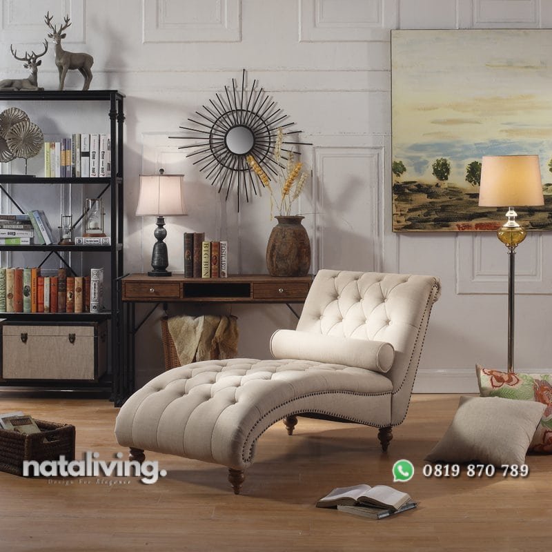 Kursi santai buat bersandar ini memililki desain yang unik dan juga menawan. Model seperti keong dengan bentuk melengkung dan balutan sofa yang sedikit melipat. Dihias juga pernak pernik kancing pada lapisan kain memperindah tampilanya.