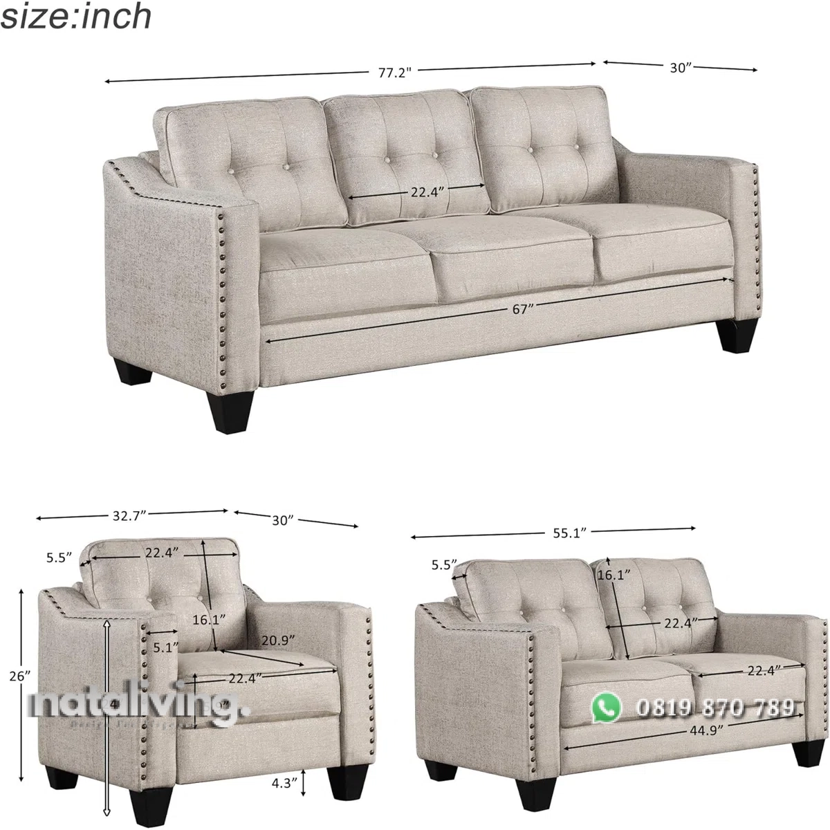 • Sofa 3 Seater : P 195 cm x L 75 cm x T 69 cm