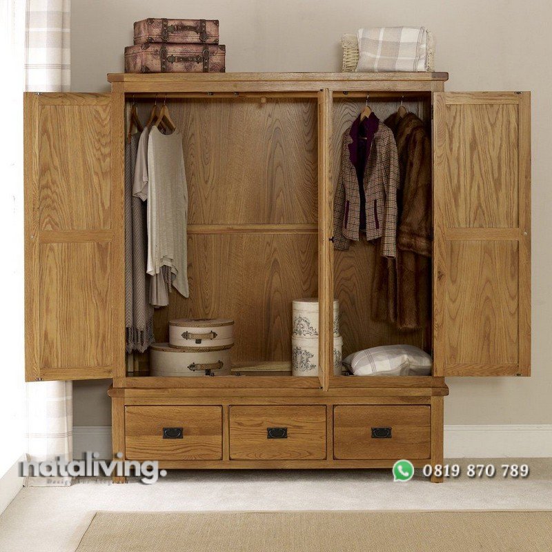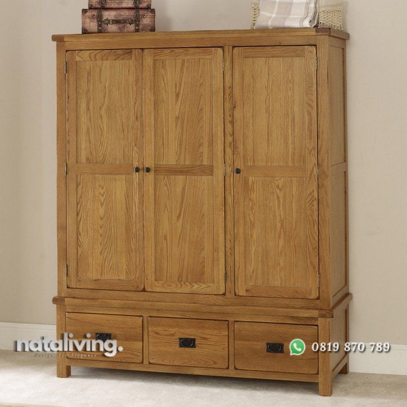Terbuat dari material kayu jati pilihan sehingga kontruksinya kokoh dan kuat. Tentunya bergaya minimalis model 3 pintu dan dilengkapi dengan 3 laci penyimpanan. Serta tampilannya diperindah dengan sentuhan finishing melamine semi gloss.