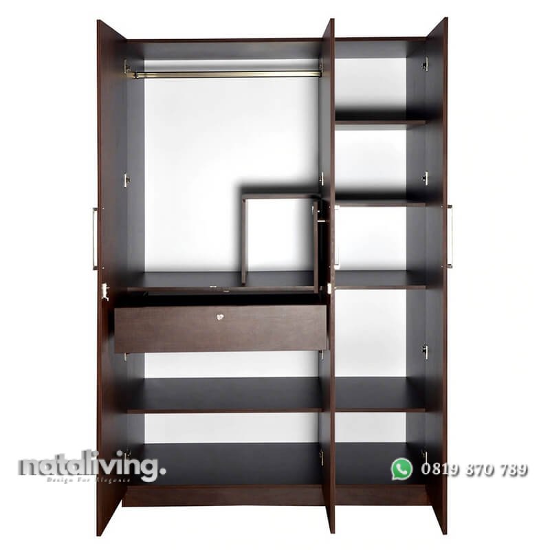 Produk unggulan yang patut anda perhitungkan dalam melengkapi furniture untuk kamar anda. Yang mana berfungsi sebagai sarana untuk menyimpan baju atau pakaian supaya tertata dengan rapi dan mudah dicari. Tentunya lemari baju ini hadir dengan konsep minimalis model 3 pintu dari kayu jati jepara. Serta untuk memaximalkan visualnya, furniture satu ini dilapisi dengan wood finishing warna walnut brown. Sehingga dengan kehadirannya dapat menambah kesan lebih indah bagi interior kamar anda.