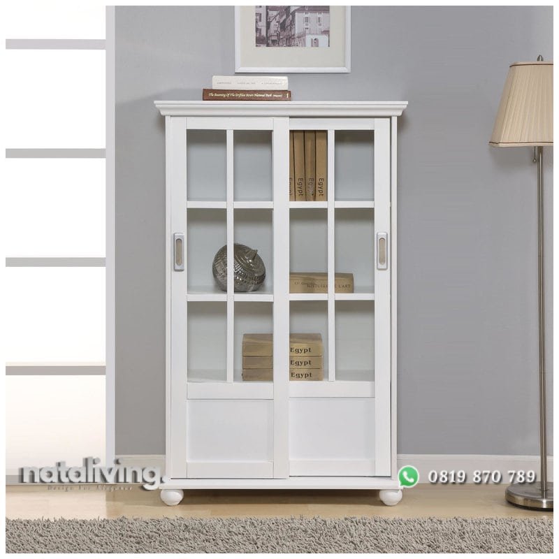 Lemari buku yang memiliki pintu geser dengan rancangan gaya minimalis, bentuknya simpel yang bisa menjadi pemanis di ruang tamu, warna putih menampilkan kesan yang lebih bersih.