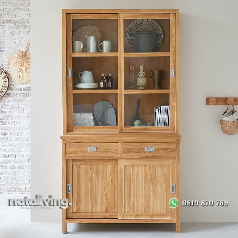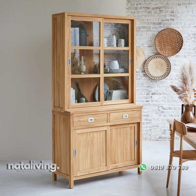 Didesain dengan konsep minimalis model terbaru yang sangat simpel namun tetap keren dengan visual warna natural cantik. Dimana desain dilengkapi 2 laci dan tempat penyimpanan berpintu sliding pada bagian bawahnya. Sedangkan untuk daun pintu sliding menggunakan kaca agar pajangan terlihar lebih jelas. Dan pastinya lemari dapur ini bahan utamanya menggunakan kayu jati pilihan dan dikerjakan langsung oleh pengerajin jepara yang sudah berpengalaman.