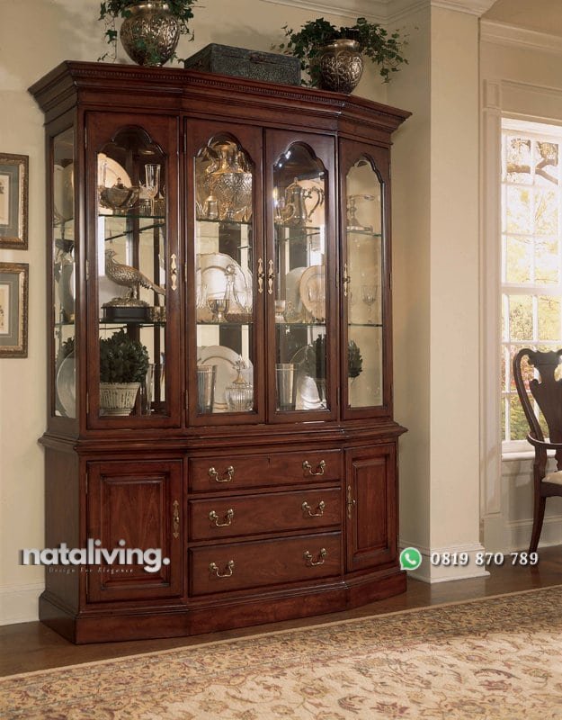 Lemari dapur dengan model 4 pintu kaca yang bisa memperlihatan perabotan dapur anda dari luar, rak atau sekat-sekat terbuat dari kaca. Terdapat 2 Pintu dan 3 Laci di bagian bawah.