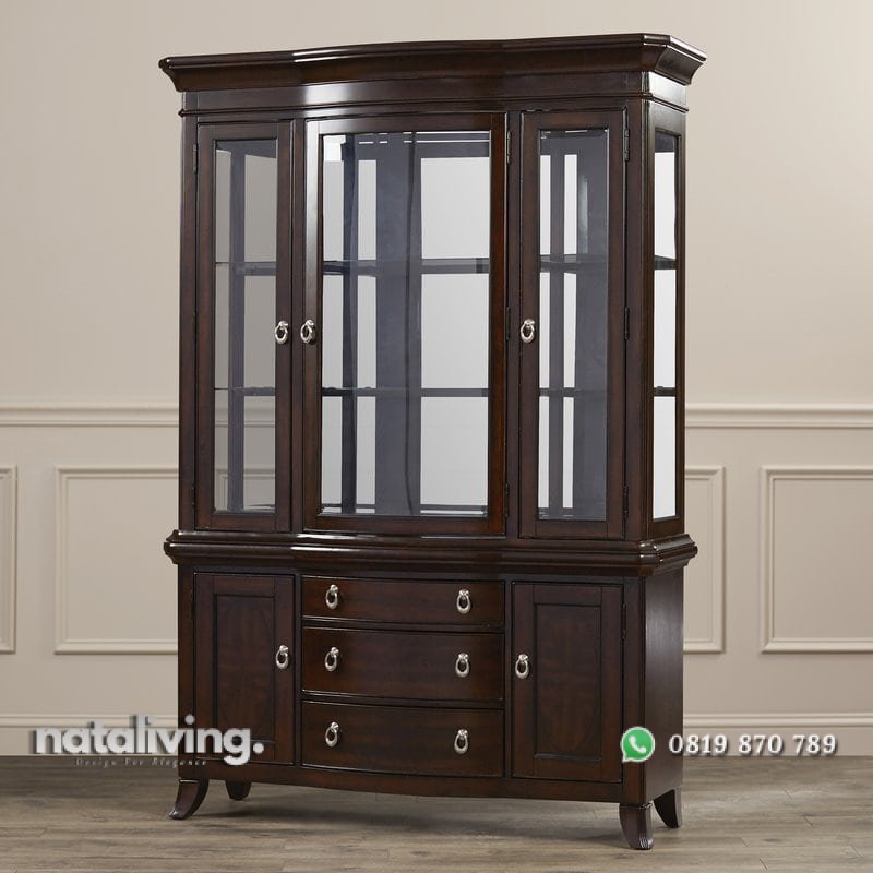 Lemari ini didesain yang minimalis dengan bentuk yang bisa membuatnya lebih multifungsi. Bagian atas terdapat pintu kaca yang besar sementara bagian bawah terdapat 3 laci dan 2 pintu kecil. Dibuat dengan material utama kayu jati menjadikan lemari ini kuat dan kokoh.