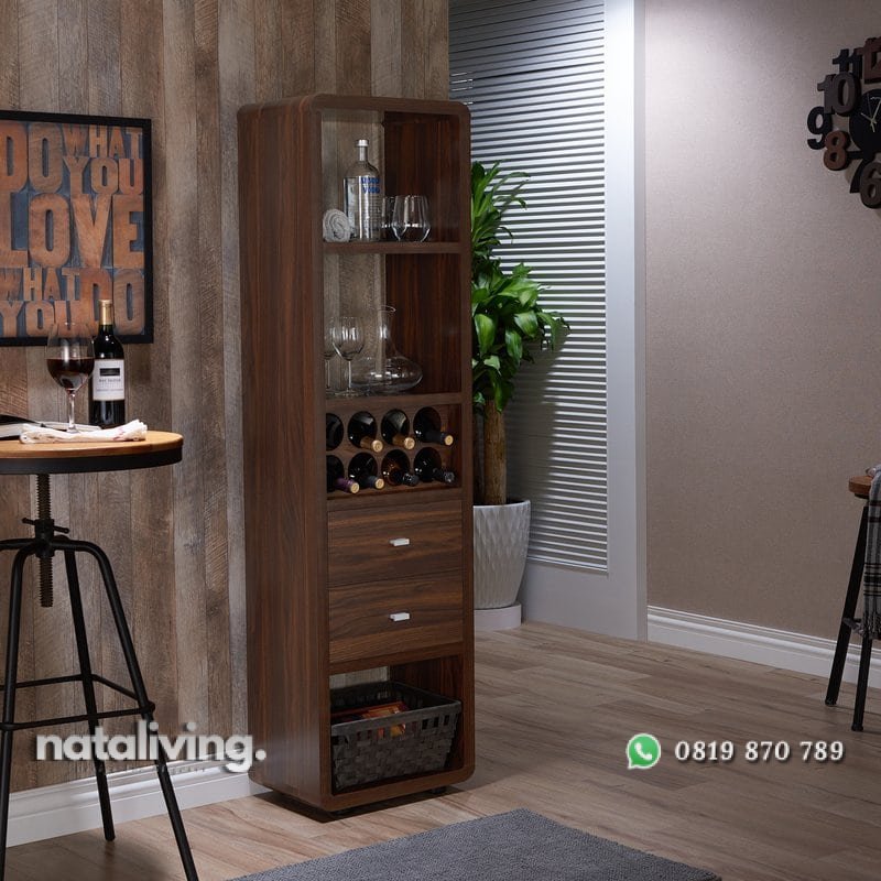 Lemari dapur ini memiliki tampilan desain minimalis, dirangcang dengan bentuk simpel dan khusus untuk menyimpan peabotan dapur, seperti gelas, piring dan botol minuman.