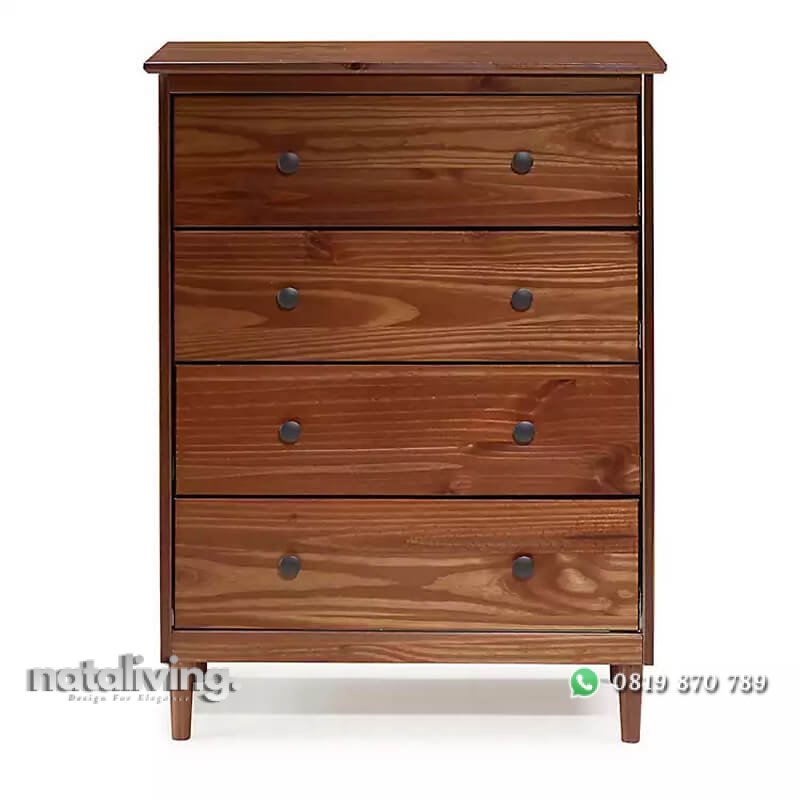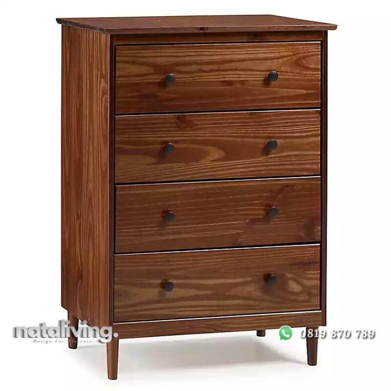 Hadir dengan konsep minimalis dengan 4 laci penyimpanan serta memiliki bentuk kaki ramping meruncing khas retro modern. Tampilannya juga sangat cantik dengan sentuhan wood finishing warna walnut brown menjadikannya semakin mempesona. Sehinga dapat memberikan warna tersendiri pada ruang kamar anda. Dan kayu jati pilihan merupakan bahan utama produk ini, sehingga terjamin kualitas kontruksnya.