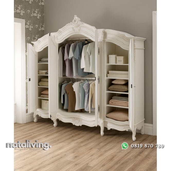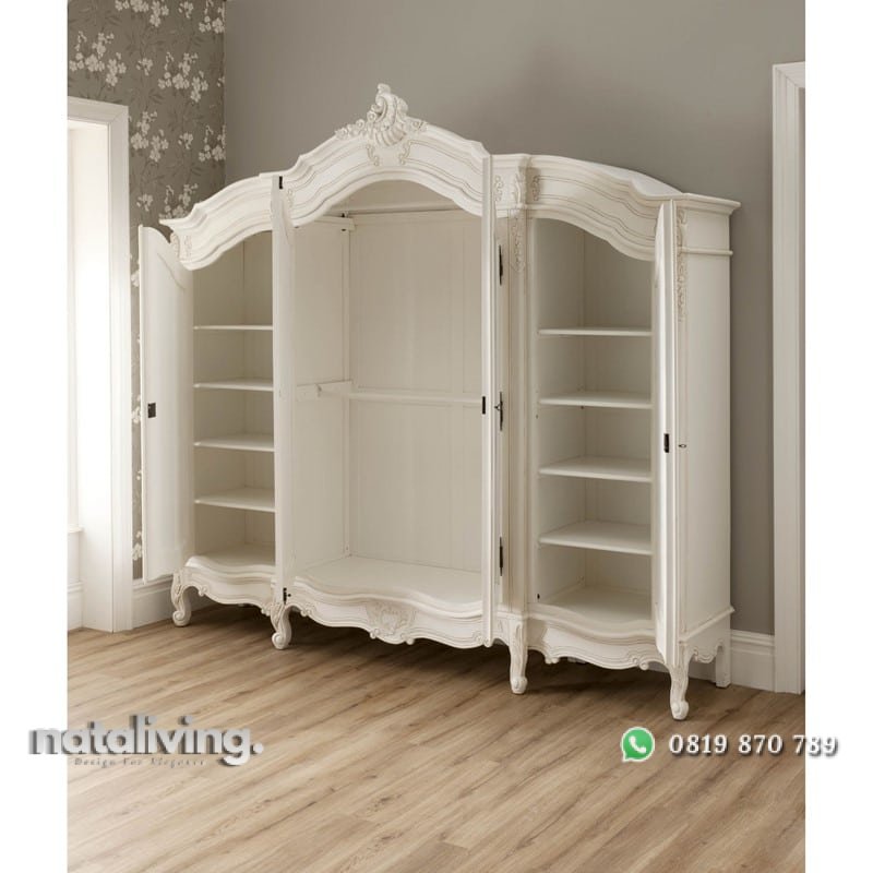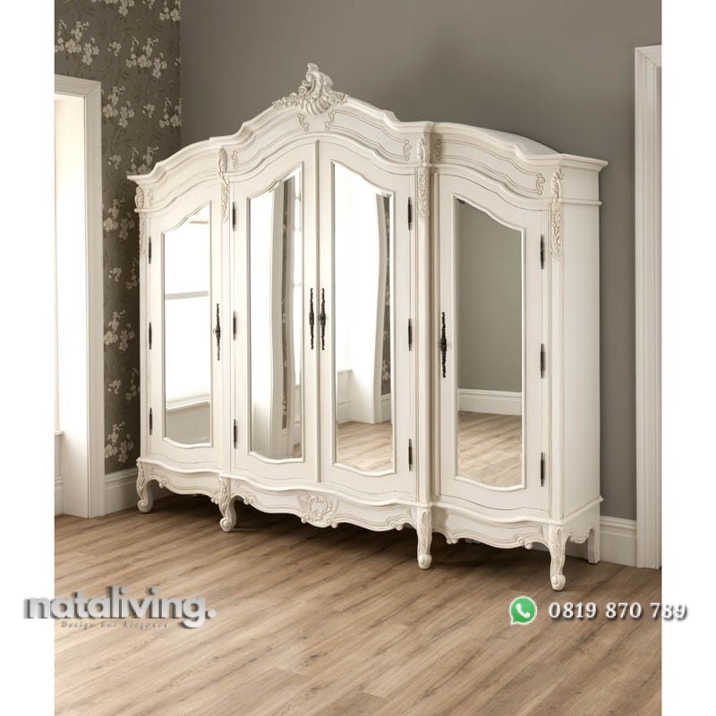 Lemari pakaian yang tampil berkelas nan mewah, memiliki ukuran yang sangat besar, dihiasi dengan sentuhan ukiran bernilai estetika tinggi. Pada pintunya juga ada kaca dan berjumlah 4, lemari yang cocok untuk Anda miliki.