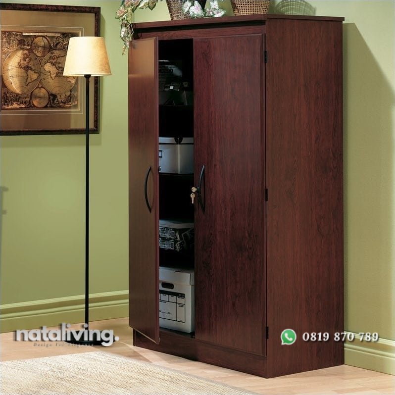 Lemari pakaian dengan desain sederhana. Terdapat 2 pintu yang aman. Bagian dalam lemari bentuk rak bertingkat.