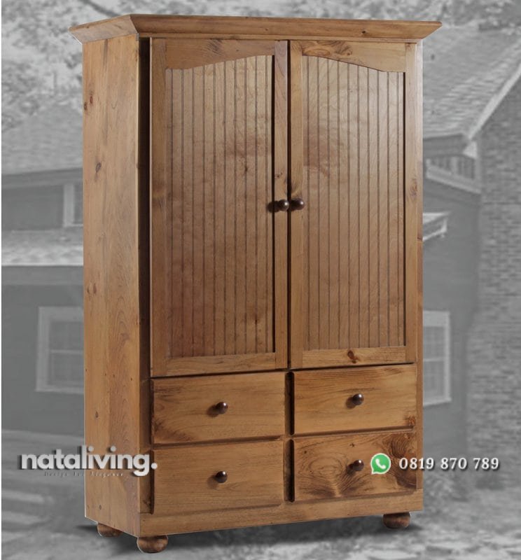 Lemari pakaian ini hadir bergaya tradisional dengan pewarnaan melamine natural yang memperlihatkan urat kayu jati yang indah dan alami. Terdapat 2 pintu dan 4 laci bisa menyimpan barang Anda.
