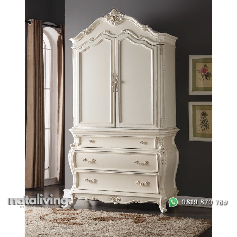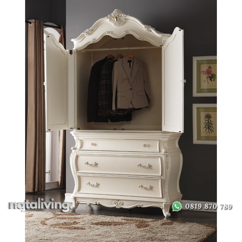 Lemari pakaian yang tampil berkelas nan mewah, dihiasi sentuhan ukiran bernilai estetika tinggi dengan pesona Eropa. Melengkapi hunian bertema minimalis mewah sangat cocok.