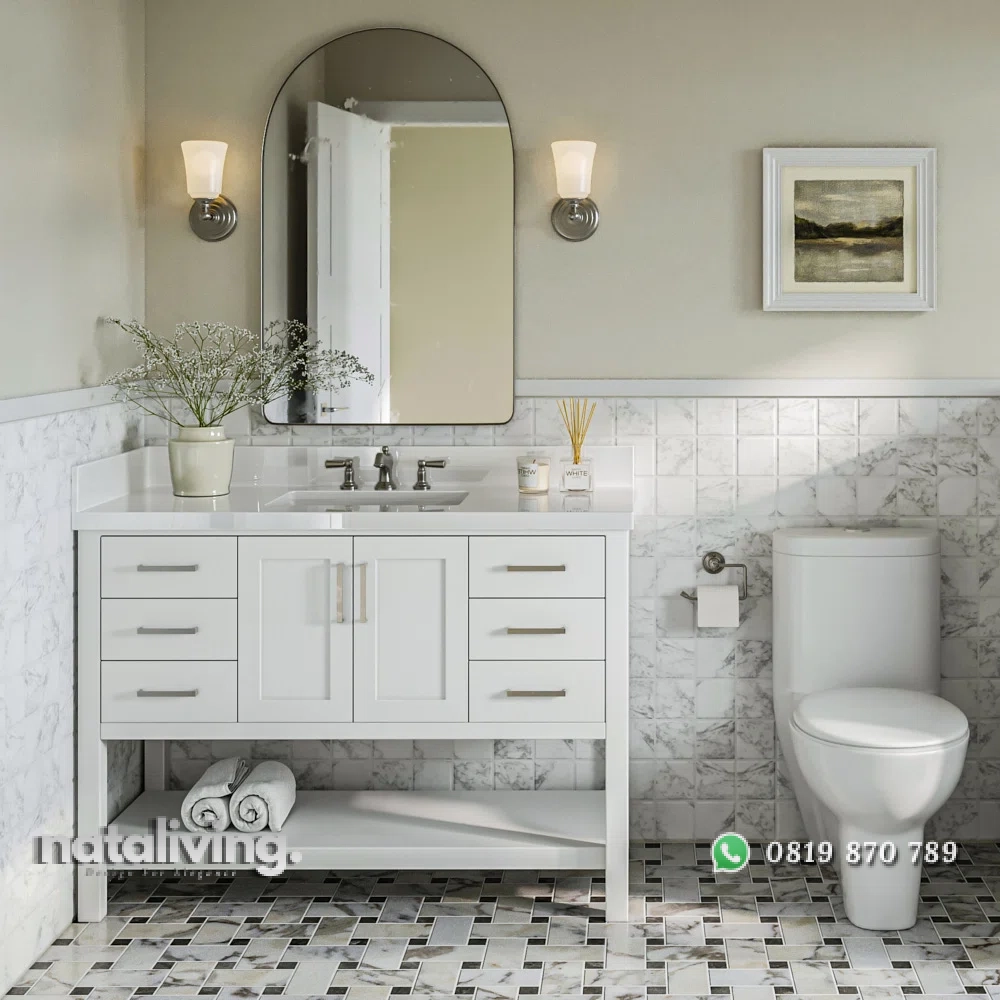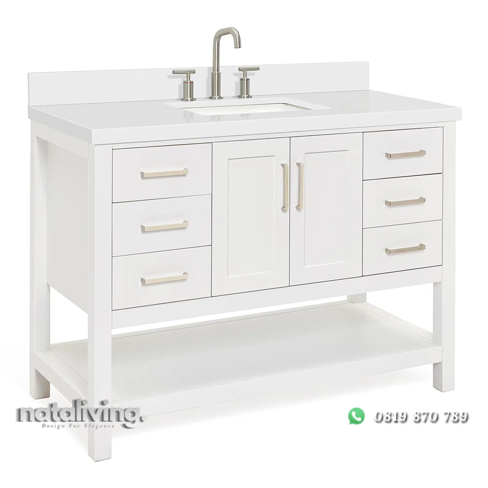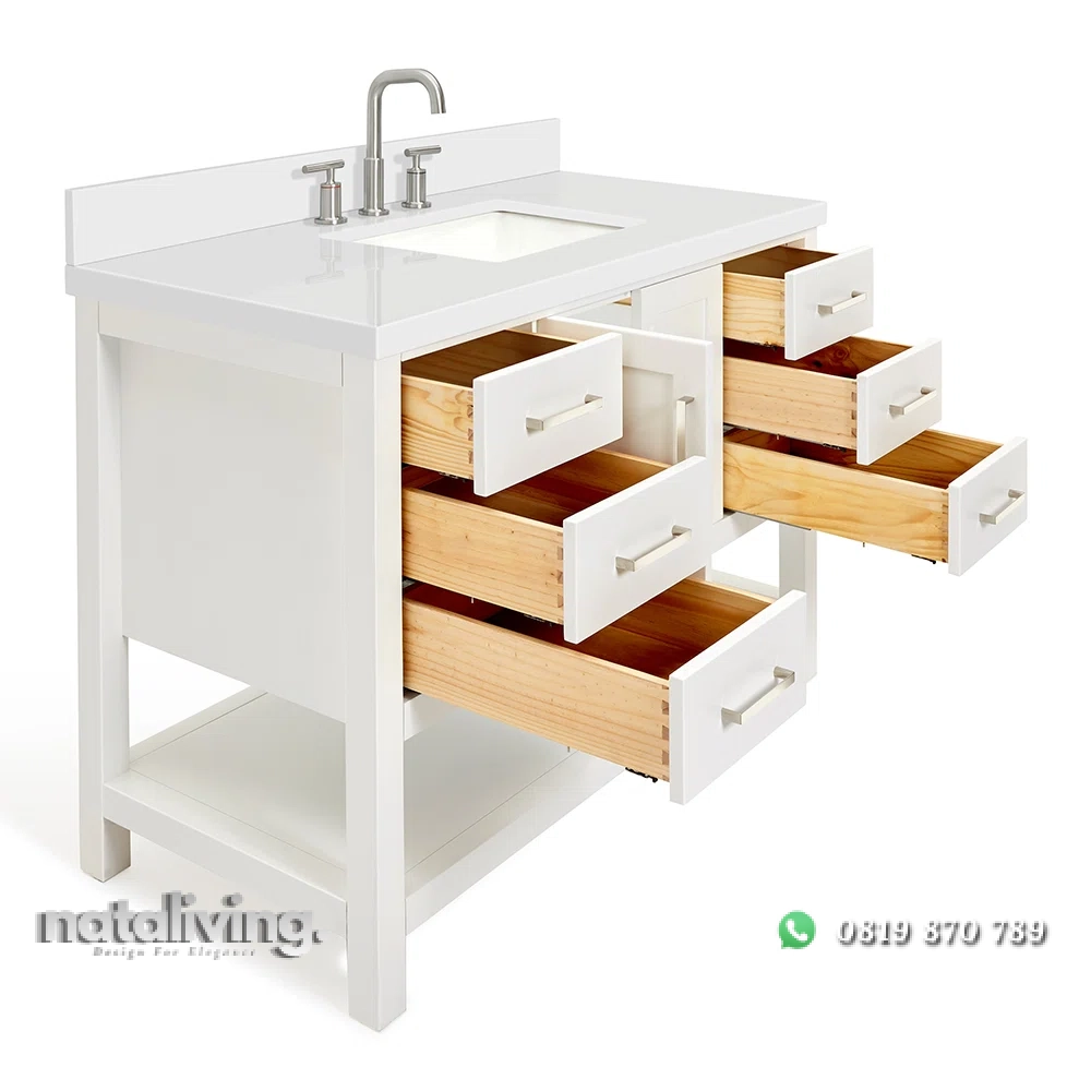 Hadirkan pesona kemewahan dalam ruang kamar mandi dan salah satu tempat cuci tangan ataupun membasuh muka Anda yaitu dengan produk ini sangat cocok untuk menjadi salah satu pilihan bagi Anda. Karena desain dari produk Wastafel Cabinet ini sangat elegant dengan mengusung tema minimalis bergaya modern yang sangat modis dan kekinian. Serta memiliki visual yang menawan berkat lapisan warna cat duco putih sehingga menambah kesan mewah juga elegant. Dan pastinya, bahan baku utama dari produk Wastafel ini diolah dengan menggunakan kayu mahogany bercampur mdf sehingga terjamin akan mutu, awet dan kualitasnnya.