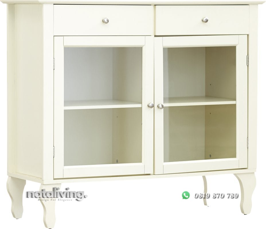 Meja yang multifungsi ini terdapat tempat penyimpanan 2 pintu kaca dan 2 laci. Memiliki desain gaya minimalis yang simpel dan terlihat indah. Anda bisa memesan dengan warna yang berbeda.