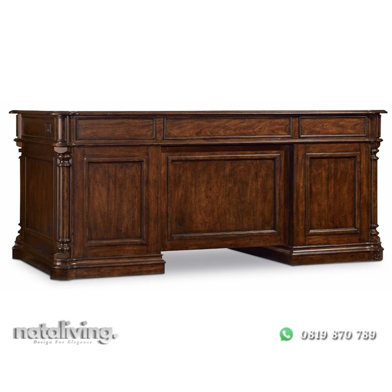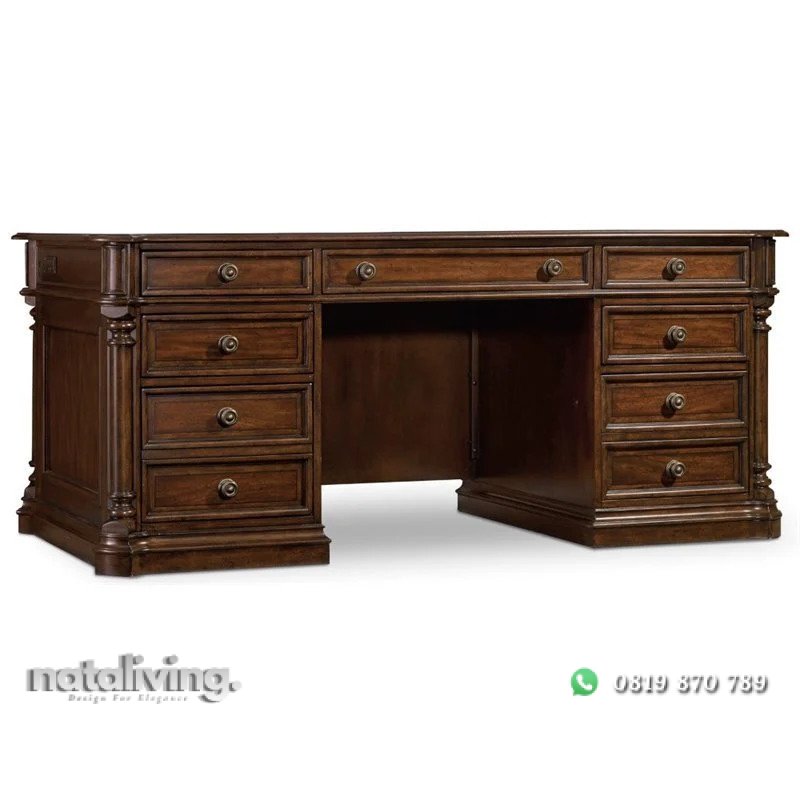 Meja ini tentunya sangat cocok sekali untuk memperindah interior ruang kantor direktur atau pemimpin perusahaan ternama indonesia. Karena terbuat dari bahan baku kayu jati kualitas bagus dengan sentuhan finishing yang cantik menjadikan tampilannya lebih berkelas dan elegant.