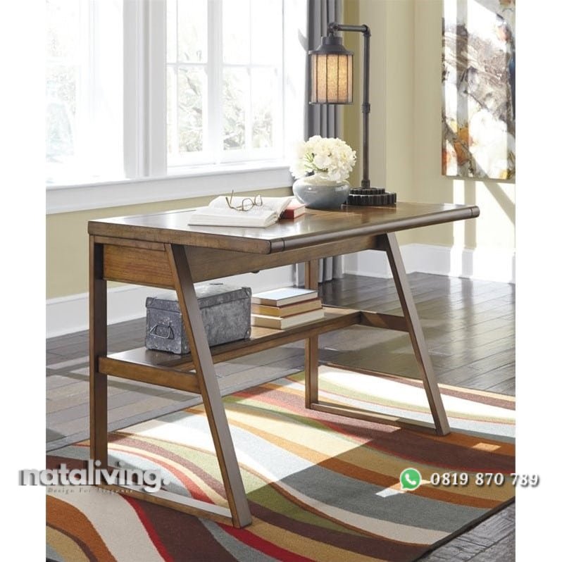 Meja kerja dengan desain bentuk yang cukup unik. Kaki depan dimiringkan dan yang belakang berdiri tegak, meja ini cocok bersentuhan dinding.