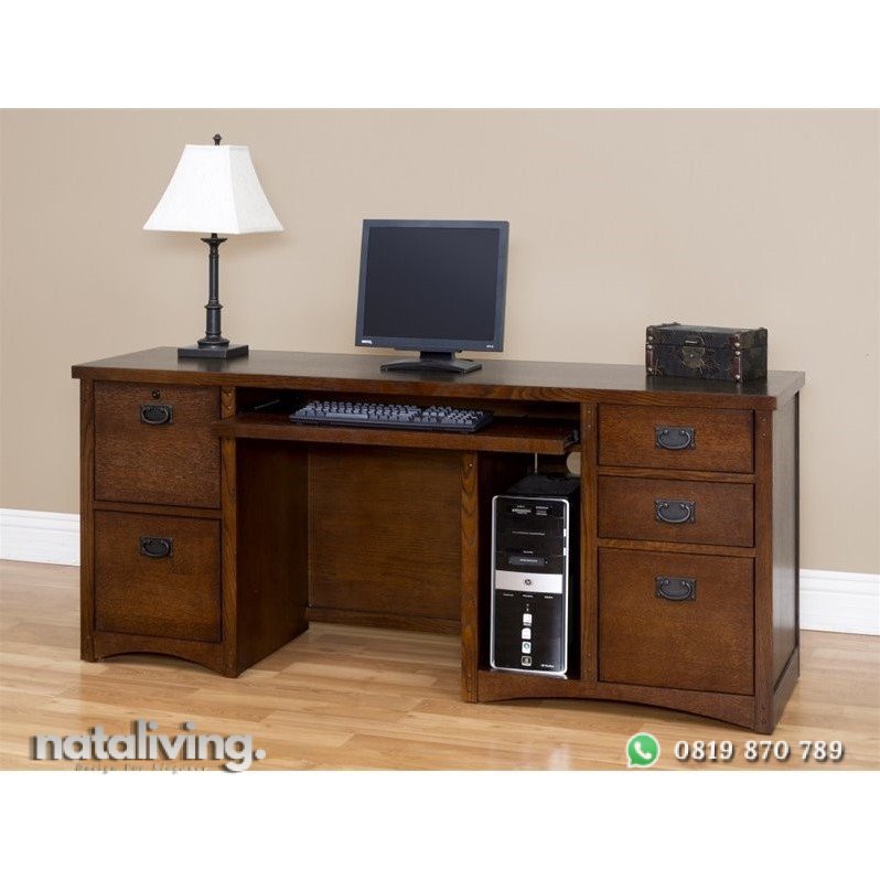 Meja kantor jati dengan model 1 biro dan desain minimalis, terdapat beberapa laci di sisi kanan dan kiri yang bisa Anda fungsikan untuk menyimpan dokumen-dokumen kerja Anda.