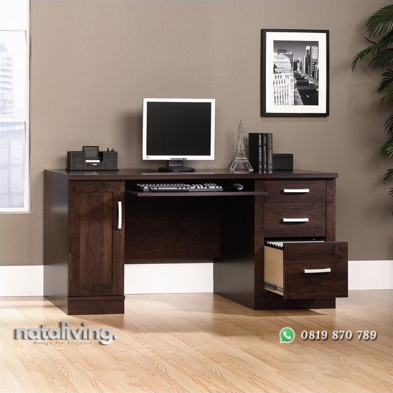 Meja kantor jati dengan model 1 biro dan desain minimalis, terdapat beberapa laci di sisi kanan dan kiri yang bisa Anda fungsikan untuk menyimpan dokumen-dokumen kerja Anda.
