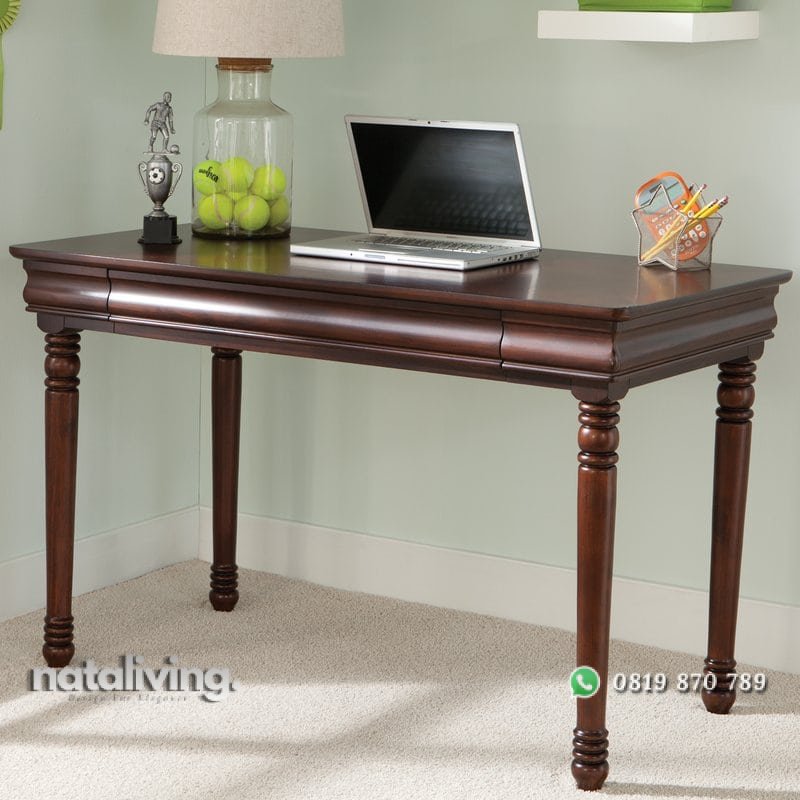 Meja kerja dengan tampilan minimalis, terdapat laci tanpa tarikan dan kaki meja dibuat lebih indah. Bahan baku dari kayu jati solid.