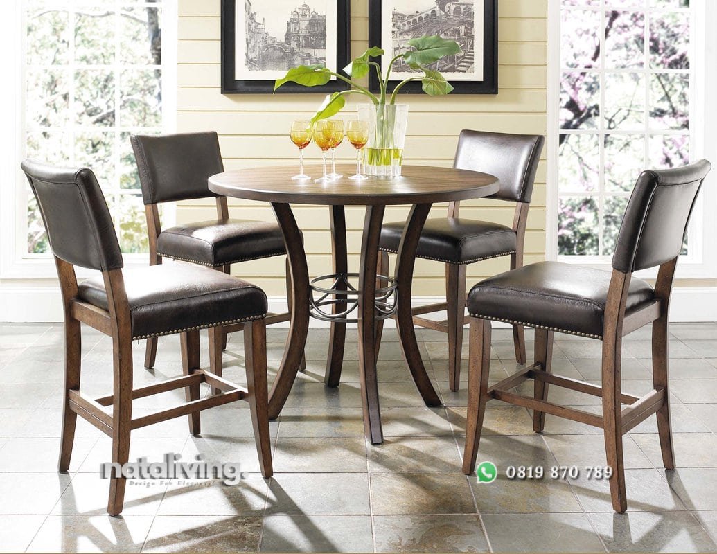 Satu set meja makan ini memiliki desain yang cantik. Meja makan dengan kaki melengkung dan ada tambahan penyimpanan di tengah. Sementara kursi dilegkapi busa empuk dibagian dudukan dan sandaran.