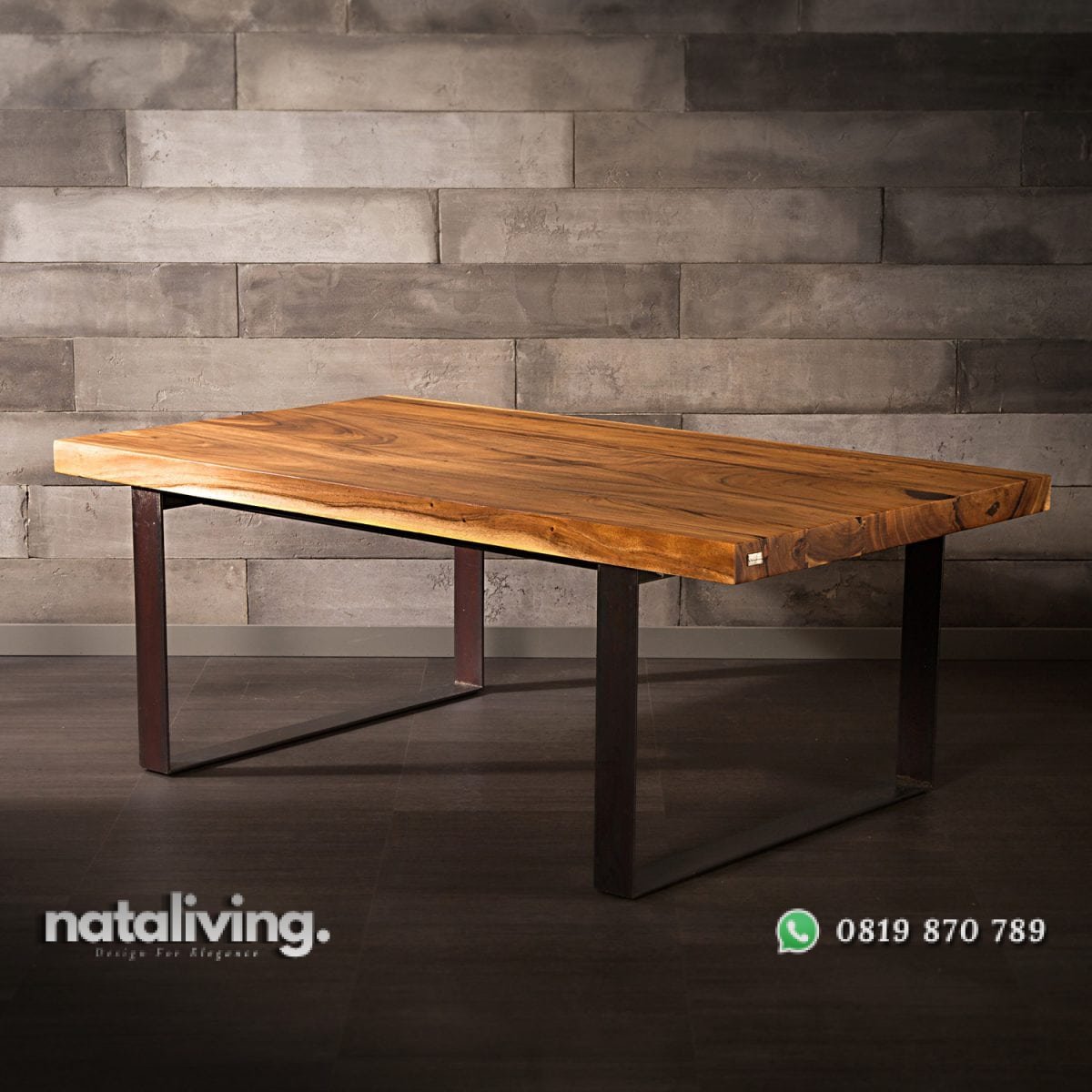 Meja makan satu ini terbuat dari kayu trembesi tanpa sambungan dengan kaki penyangga dari besi menghasilkan konstruksi lebih kuat, berdiri kokoh dan juga awet.