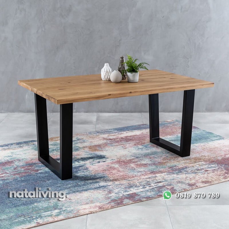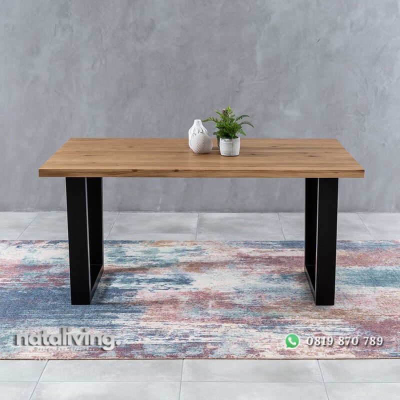 Hadir dengan konsep minimalis dengan model kaki besi warna hitam, sehingga tampilannya lebih modern dan modis. Dan untuk daun mejanya terbuat dari kayu jati pilihan dengan sentuhan wood finishing light brown. Sehingga sangat tepat untuk menambah suasana modern akan tampilan interior ruang makan anda.