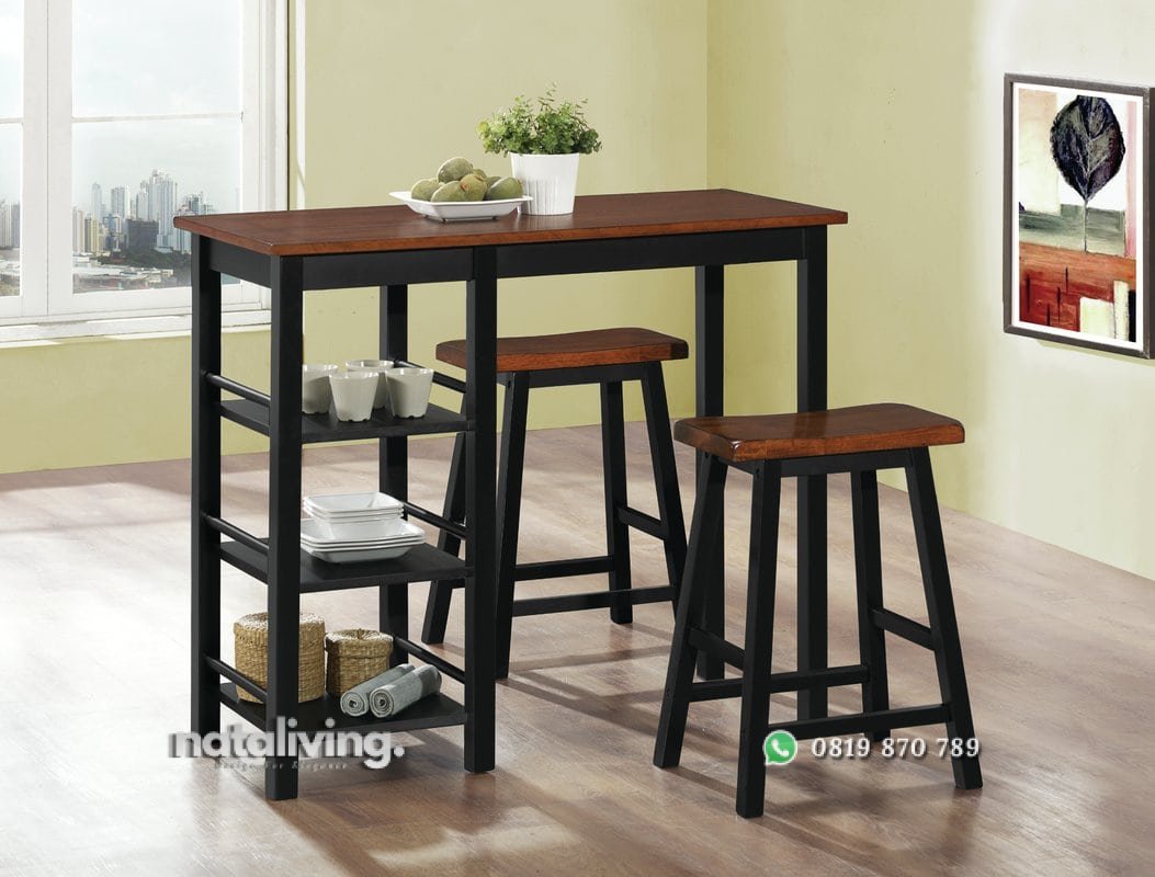 Set meja makan dengan tampilan yang cantik, memiliki kombinasi warna coklat dan hitam yang bagus. Desainnya simpel dan meja ada rak bertingkat di samping membuat lebih multifungsi.