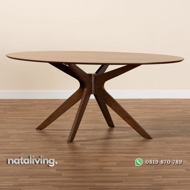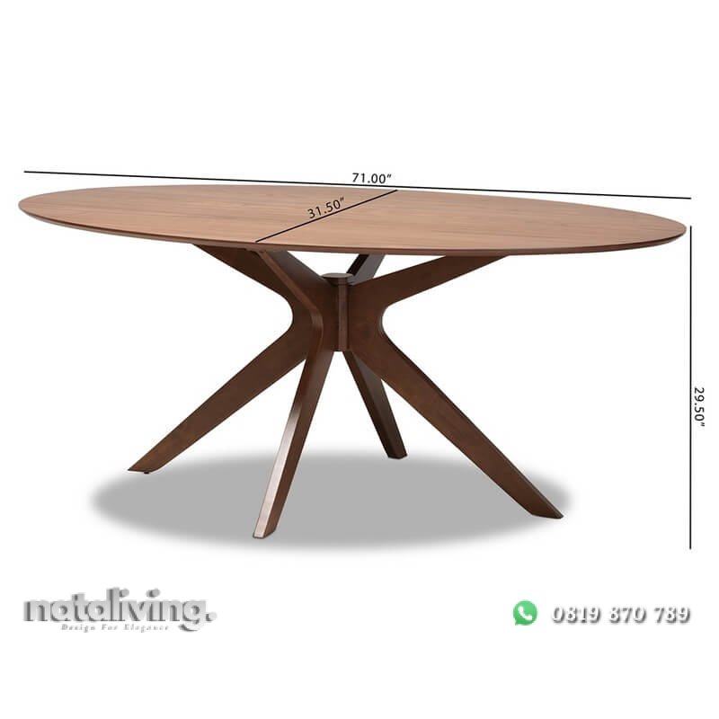 Hadir dengan konsep minimalis dengan top meja berbentuk oval serta memiliki kaki silang (X) dari bahan kayu jati pilihan. Tampilannya juga sangat indah dengan lapisan wood finishing warna walnut brown mampu memberikan warna tersendiri pada interior ruang makan anda. Dan pastinya meja ini sangat tepat sekali untuk disandingkan dengan kursi makan model minimalis atau modern yang sedang hits saat ini.