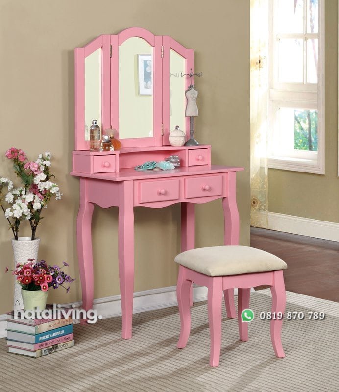 Meja rias anak dengan desain yang indah dan tampilan warna yang digemari. Model cermin yang besar dan bisa diatur posisinya membuat lebih menyenangkan. Sudah termasuk kursi untuk duduk saat berdandan.
