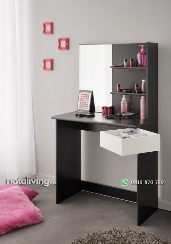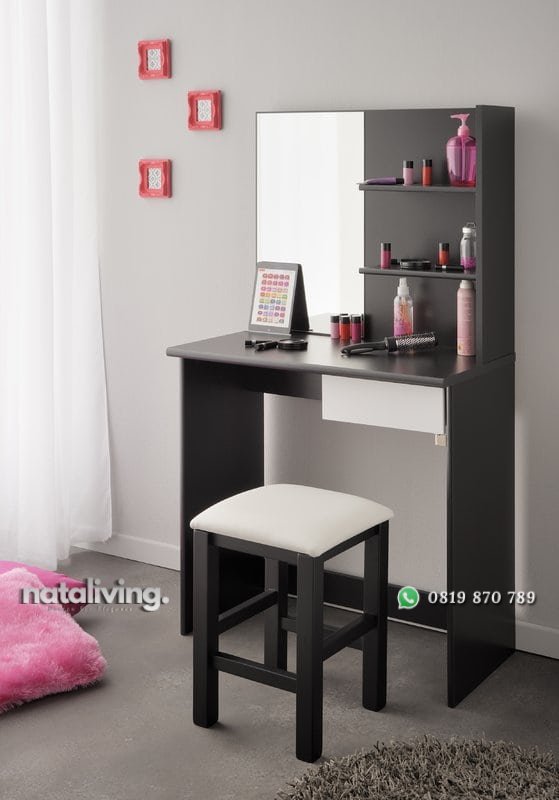 Meja rias dengan desain yang mutifungsi ada rak bertingkat buat menaruh alat make up atau perlengkapan lainya. Bentuknya unik dan simpel. Pilihan tepat buat furniture masa kini.