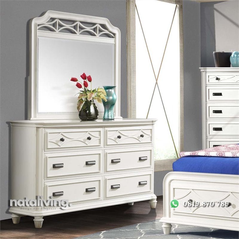 Meja rias ini berkonsep vintage menampilkan kesan antik yang tetap modern, ada 6 laci dengan tarikan yang menarik bagian atas ada ganggang mungil dan bawah bentuk lebih besar yang masa kini, dihias juga sentuhan ornamen sederhana yang membut tampil lebih cantik.