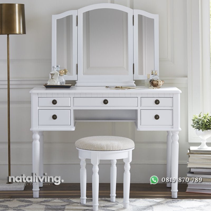 Meja rias yang memiliki tiga cermin ini bisa membuat riasan wajah Anda terlihat dari segala sisi karena posisi cermin bisa Anda atur sesuai selera. Desain konsep minimalis kesan yang simpel dan praktis. Produk sudah termasuk sama kursi.