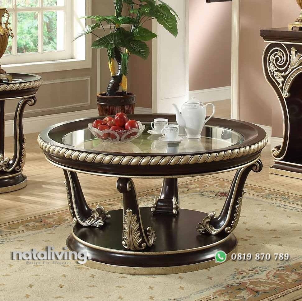 Meja tamu bundar yang telah dirancang dengan atasan atau top meja dari kaca dan dilengkapi dengan rak di bawahnya yang membuat lebih menarik, Tampilan desainnya minimalis dan di hiasi ornamen ukiran tetap terlihat bugar diruang tamu.