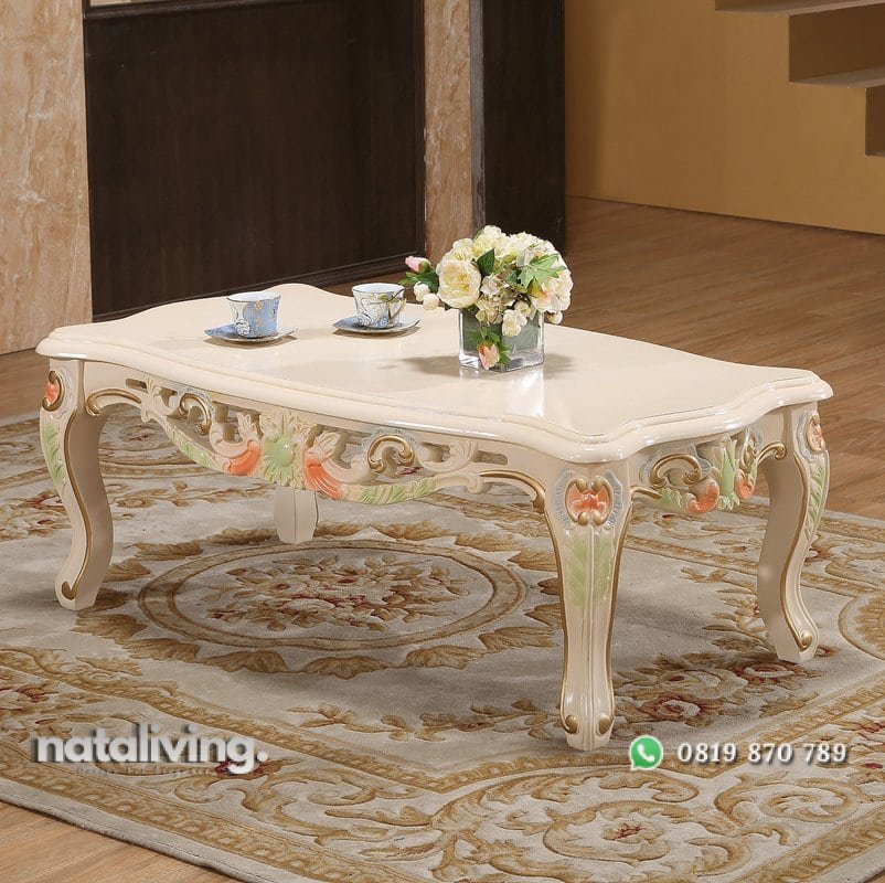 Hadir dengan desain yang mewah, meja tamu ini dihiasi ornamen ukiran dengan tampilan warna kombinasi yang terlihat semakin istimewa. Dengan Anda memakai meja ini bisa menambah ruangan tamu Anda terlihat lebih mewah dan elegan.
