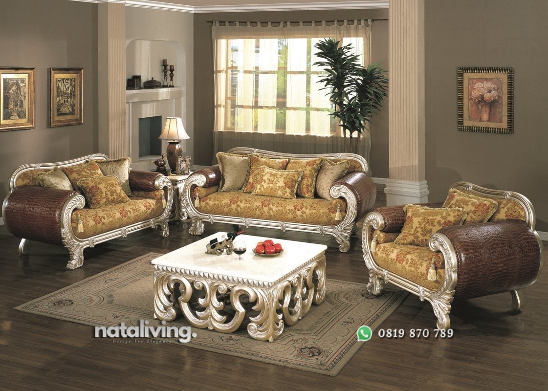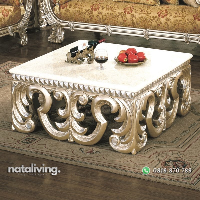 Hadir dengan desain yang mewah, meja tamu ini memiliki ukir-ukiran yang bagus dan indah selain itu di tambah dengan tampilan warna emas ini semakin terlihat istimewa.