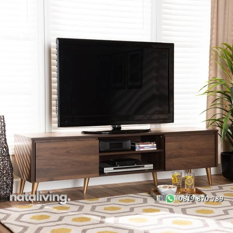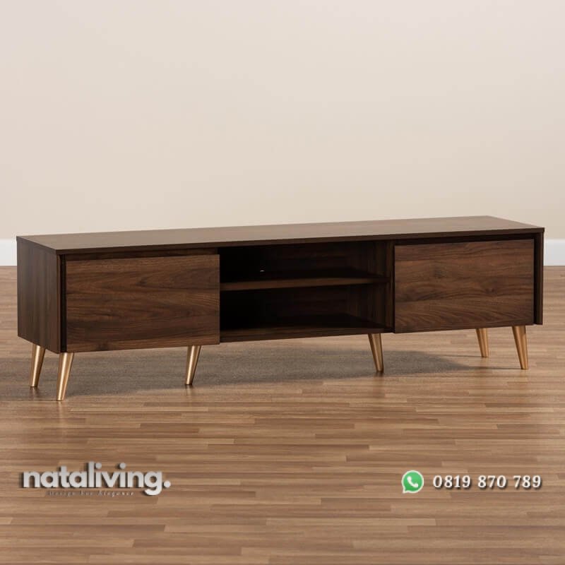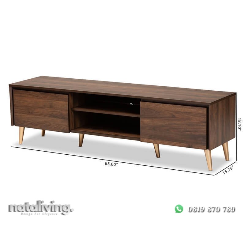 Varian terbaru yang patut anda jadikan rujukan dalam melengkapi hunian idaman anda. Karena meja tv satu ini didesain dengan konsep minimalis modern dengan sentuhan retro style yang sedang booming di Indonesia. Tampilannya juga sangat memukau dengan lapisan finishing warna walnut brown dan dikombinasikan warna gold pada bagian kaki ramping meruncingnya. Sehingga dengan adanya produk ini akan dapat menambah varian warna indah di interior rumah impian anda.