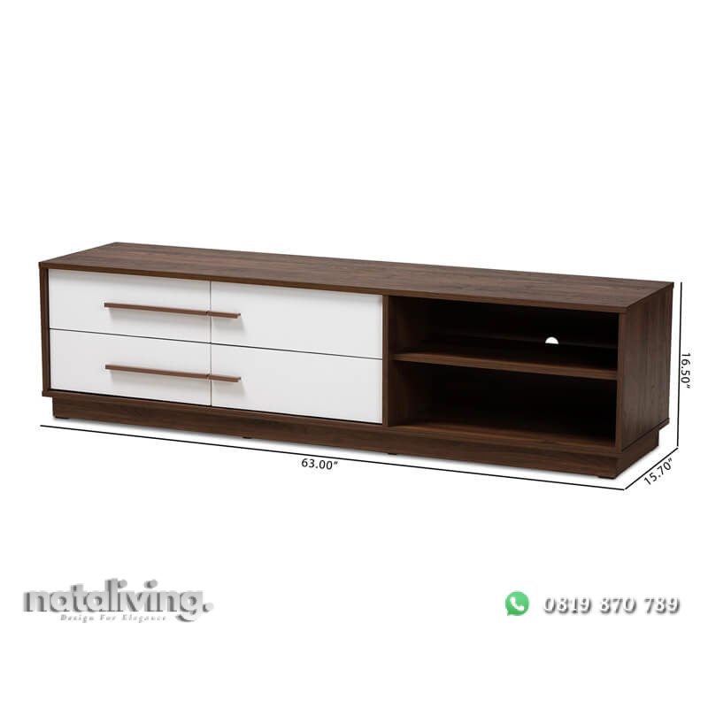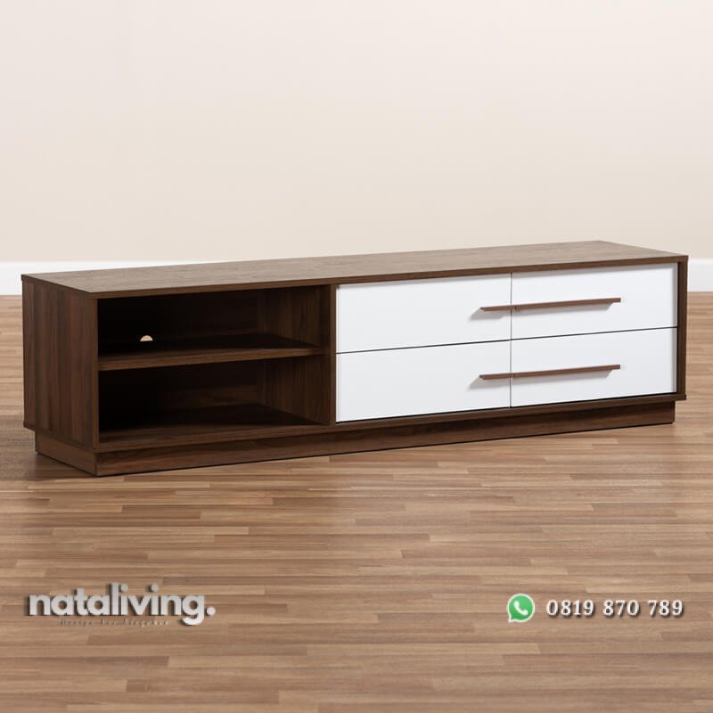 Hadir dengan konsep minimalis modern gaya terbaru yang sedang trend untuk memenuhi furniture pada rumah masa kini. Desainnya sangat minimalis dengan dilengkapi fitur laci penyimpanan serta tempat untuk DVD player, PS atau game konsol lainnya. Tentunya Bufet TV ini terbuat dari bahan kayu jati pilihan kualitas bagus dengan tampilan yang memukau dari perpaduan warna wood finishing warna walnut brown dengan duco finishing warna putih.