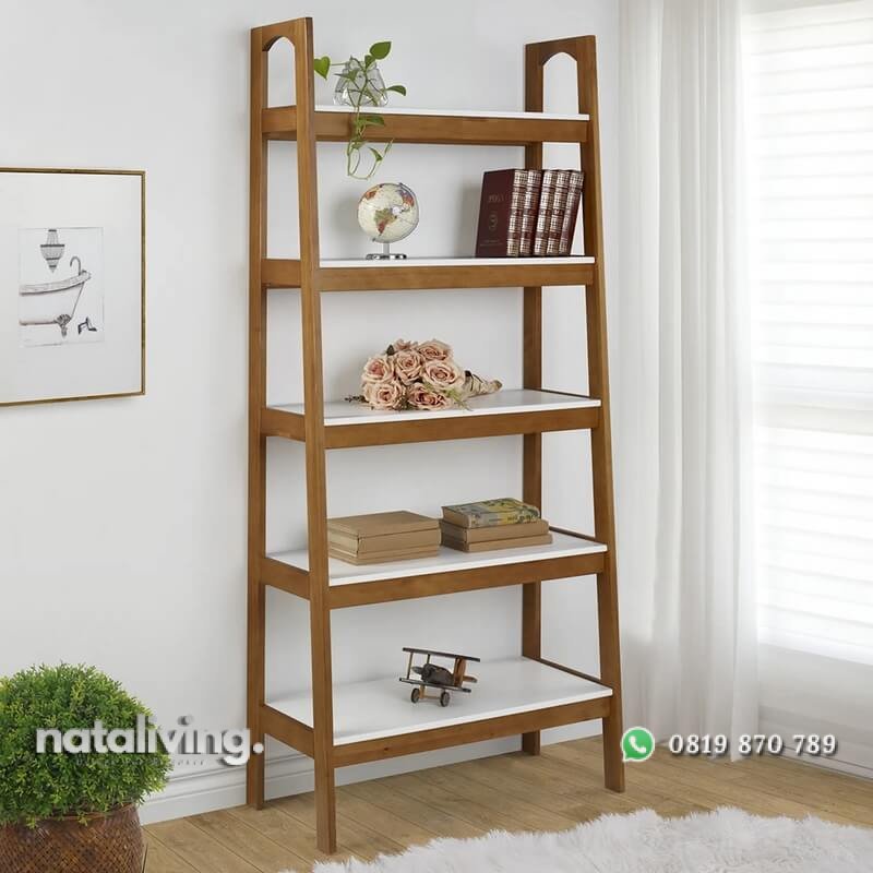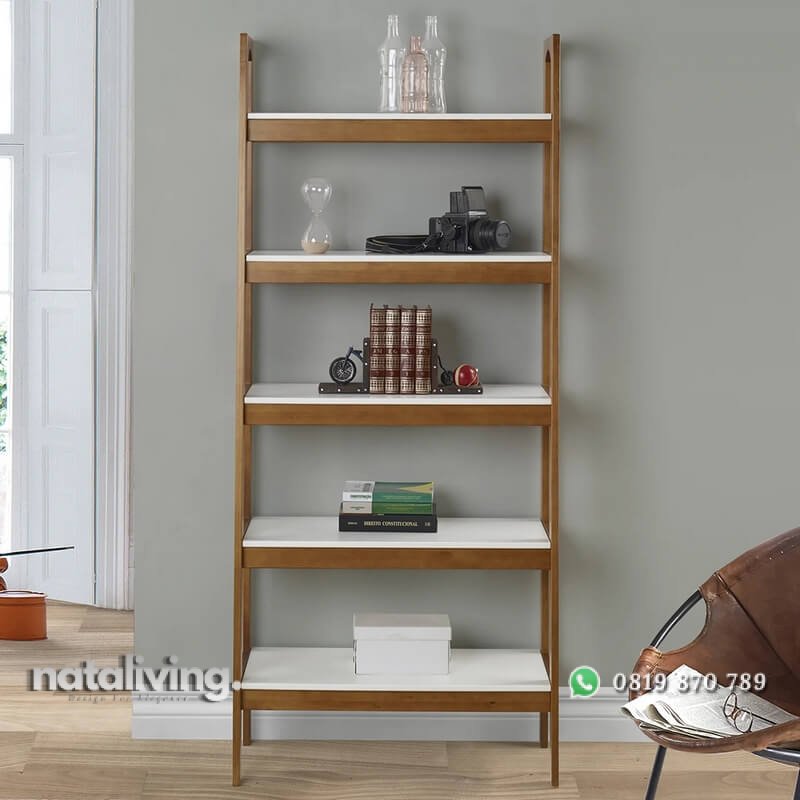 Salah satu varian rak buku minimalis model terbaru yang sangat tepat sekali untuk menjadi pelengkap furniture pada ruang tamu anda. Dimana terbuat dari bahan kayu jati dan ditambahkan kayu mahoni sebagai ambalannya. Dan untuk menyempurnakan tampilannya, rak ini dilapisi wood finishing warna walnut. Sedangkan bagian ambalan dilapisi dengan finishing cat duco warna putih tebal, halus dan rapi. Sehingga dengan kehadirannya dapat membuat ruang tamu anda semakin modis dan kekinian.