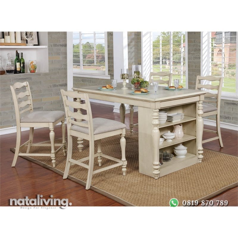 Set meja makan ini memiliki tampilan modern yang terlihat keren, meja memiliki rak yang menambah keindahanya, sementara kursi di balut sofa putih kesan modern yang ditampilkan menarik.