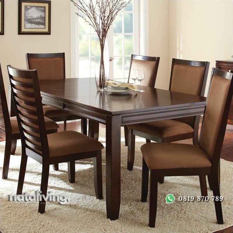 Set meja makan dengan tampilan klasik sederhana terbuat dari kayu jati dengan finishing melamine yang bagus, paket produk tersedia 1 meja dan 6 kursi.
