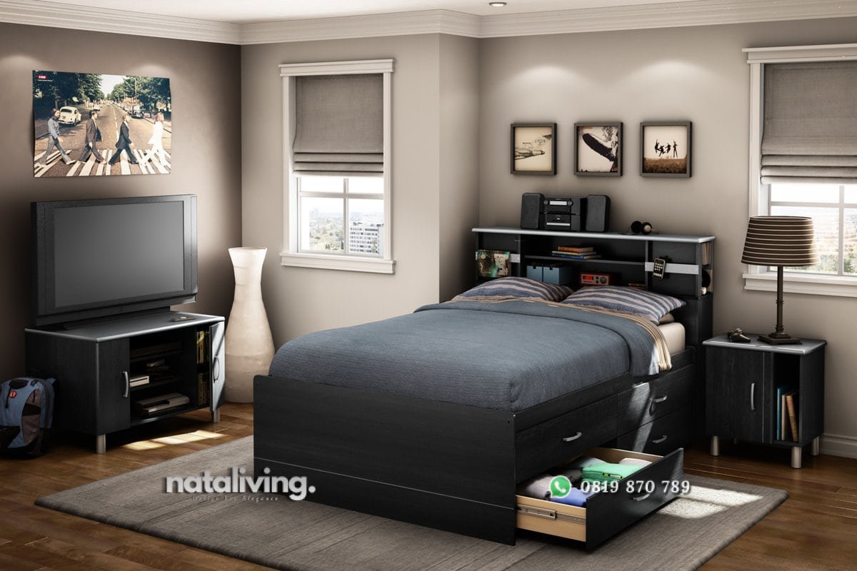 Kamar tidur berukuran kecil namun butuh banyak tempat penyimpanan, satu set tempat tidur ini cocok buat Anda. Desain yang minimalis dengan dilengkapi banyak tempat penyimpanan. Terdiri dari tempat tidur, meja tv dan nakas.