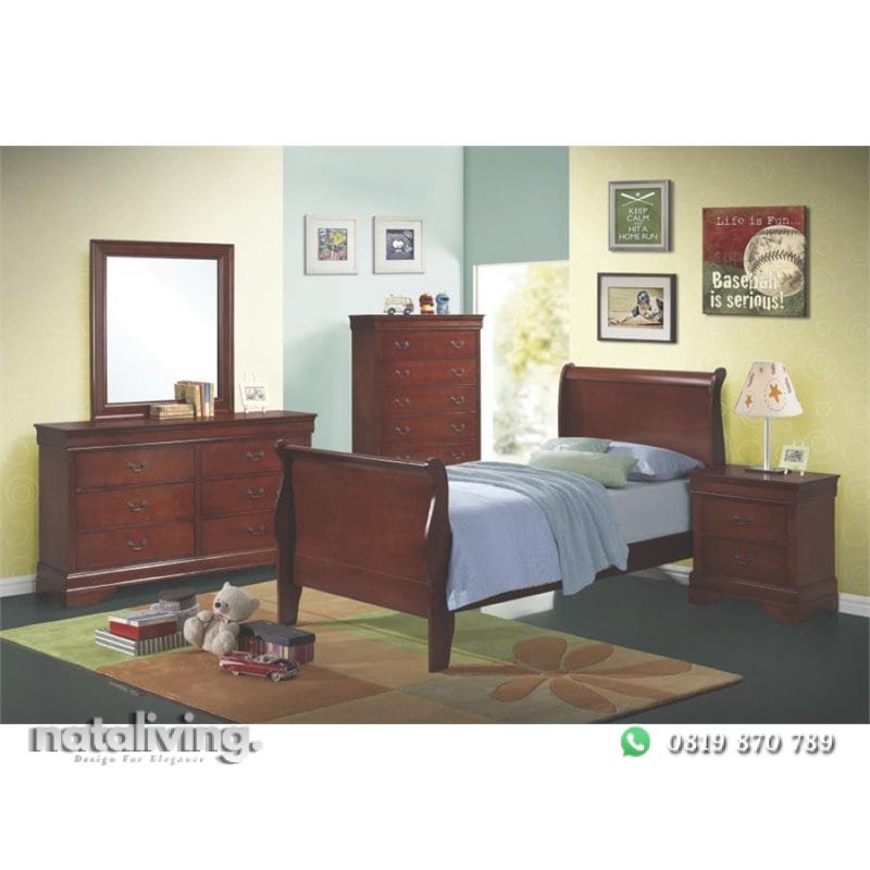 Produk satu set tempat tidur telah didesain khusus untuk anak yang terdiri dari tempat tidur bagong, nakas, meja rias dan juga drawers. Satu paket produk memiliki warna putih menggelora dengan cerah akan menampilkan kesan lebih bersih dalam rumah.