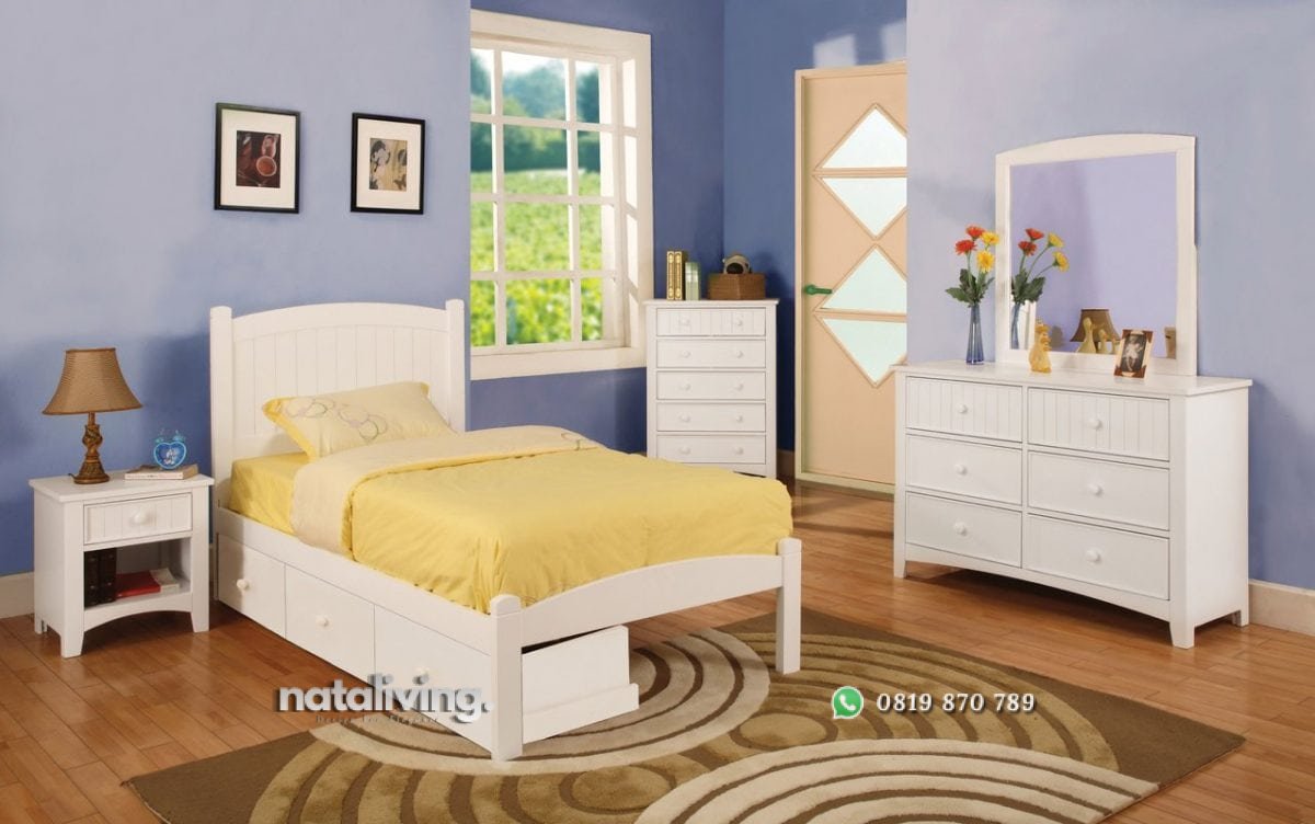 Satu set tempat tidur anak ini semua produk memiliki laci, desain yang simpel dan dilengakpi banyak laci ini cocok untuk anak yang suka mengoleksi banyak barang.