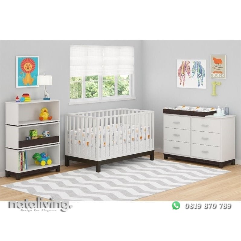 Furniture bayi satu set ini sudah lengkap tersedia tembat tidur bayi, lemari pakaian dan drawers dengan tambahan alas diatasnya yang dapat digunakan tempat berbaring bayi saat mengganti popok.