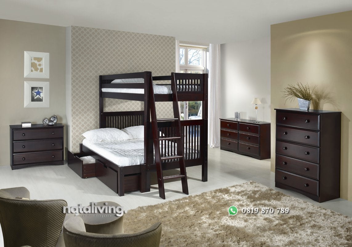 Memiliki dasain bergaya minimalis satu set tempat tidur tingkat ini sangat cocok Anda terapkan di hunian bergaya modern. Tampilan yang simpel dan terlihat indah akan menjadi tempat istirahat anak yang nyaman. Selain Anda membeli satu set Anda juga bisa membeli dalam satuan atau per item.